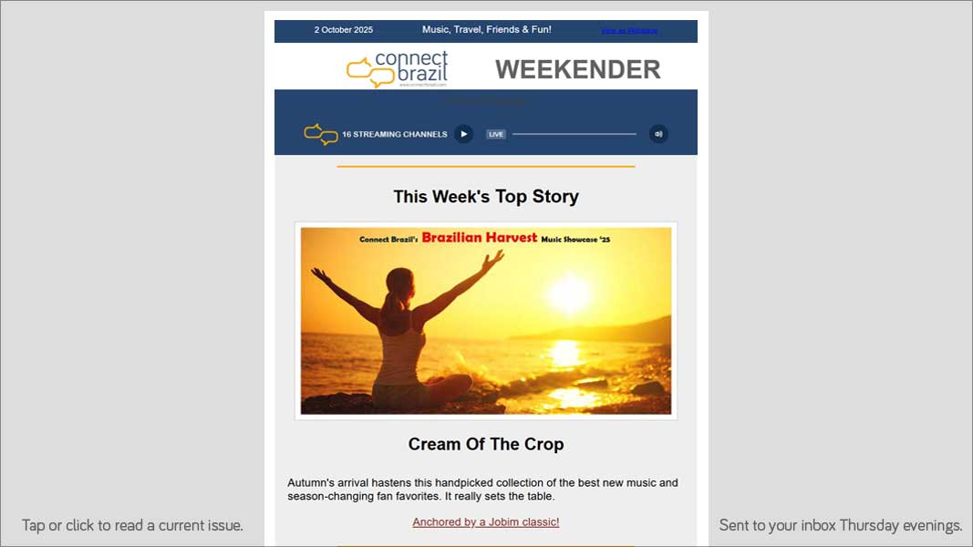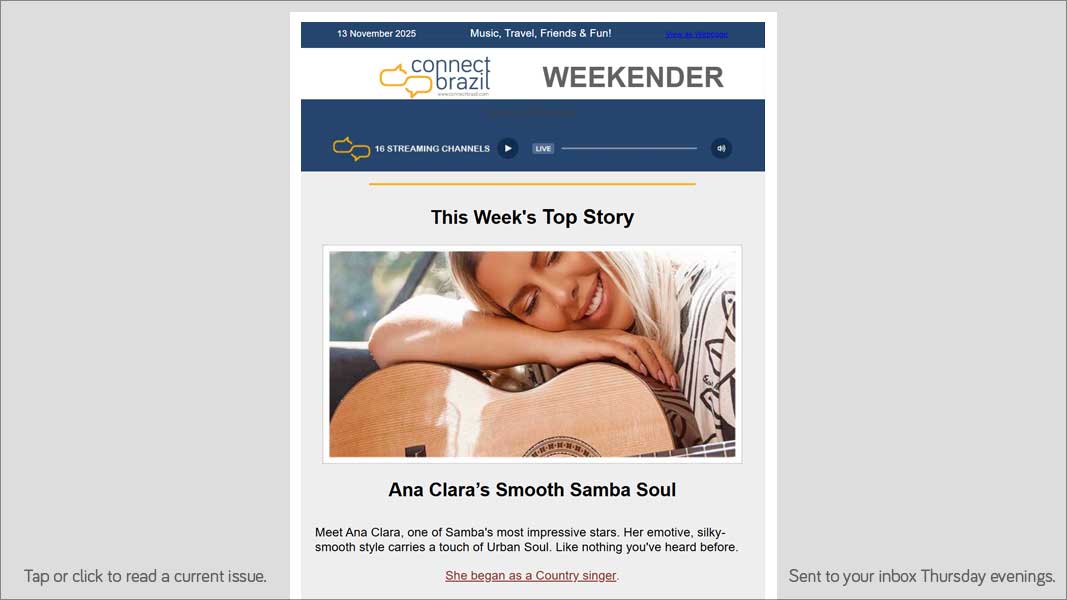 Connect Brazil’s Weekender e-letter is free. America’s most active and engaged fans stay informed and entertained with the most-read e-letter on Brazilian music, travel, entertainment, cuisine, and culture.